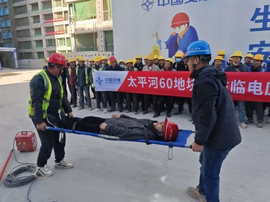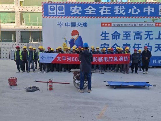 共工新闻社12月15日电(通讯员:庞娟娟)12月14日,太平河项目部组织施工班组、安全管理人员全员参与,现场“太平河60#地块消防临电应急演练”横幅醒目,人员身着安全帽、反光背心集结,呼应工地“生命至上、安全第一”的安全标语。