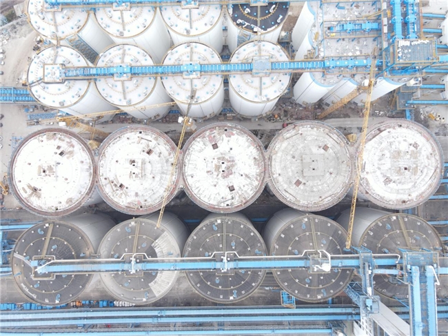 防城港粮食输送改造(六期)工程是区域粮食仓储物流体系升级的重点项目,规划建设总仓容达31.45万吨的筒仓群,涵盖多类型、大跨度仓储设施,是目前广西区内规模最大、高度最高的筒仓群。其中,包含仓顶高度40米、直径25.6米、单仓仓容1万吨的浅圆仓8座;仓顶高度41.8米、直径15.5米、单仓仓容3500吨的立筒仓9座(总仓容3.5万吨);仓顶高度47.5米、直径32米、单仓仓容2.15万吨的大直径筒仓5座;仓顶高度44.5米、直径25.6米、单仓仓容1.15万吨的大直径筒仓8座。