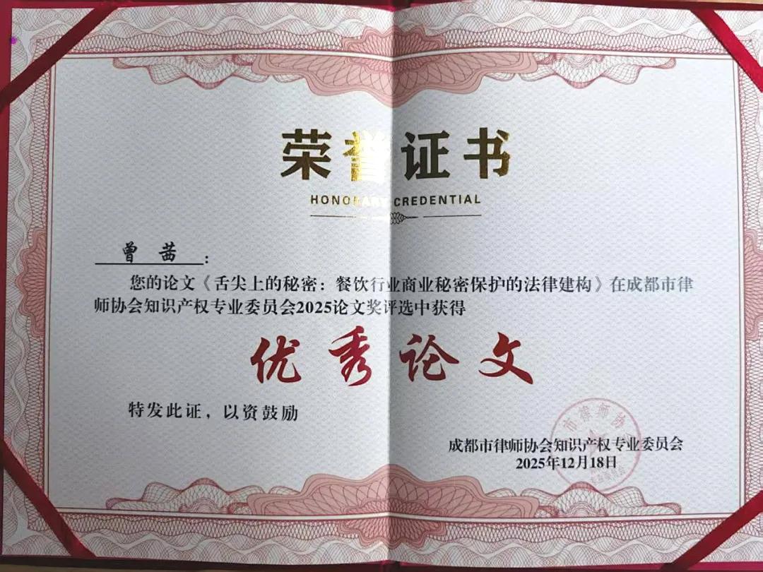 共工社•共工财经局12月25日电(雷良)窗外冬雾弥漫,屋内“法”香四溢。近日,成都市律师协会知识产权专业委员会组织评选的2025年度优秀论文结果正式揭晓。四川盛豪律师事务所曾茜律师撰写的《舌尖上的秘密:餐饮行业商业秘密保护的法律建构》一文,凭借其深刻的行业洞察、系统的理论分析与务实的建构路径,在评选中脱颖而出,荣获成都市律协知识产权专业委员会2025年度“优秀论文”称号。