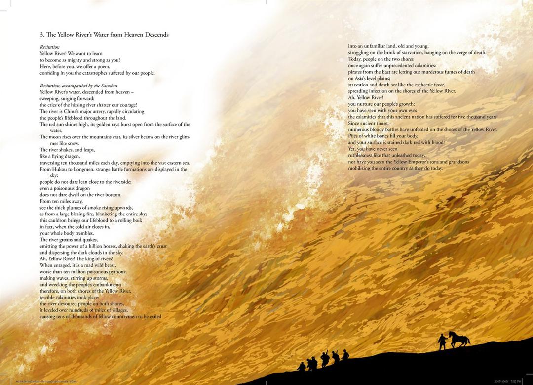 在这组作品中,我努力营造一种绘画与诗歌浑然一体的意境。天地、山水、线条与色彩,随着《黄河大合唱》的诗句起伏、奔腾、飞舞、歌唱,使每一个乐章都呈现出黄河不同的性格与情感。